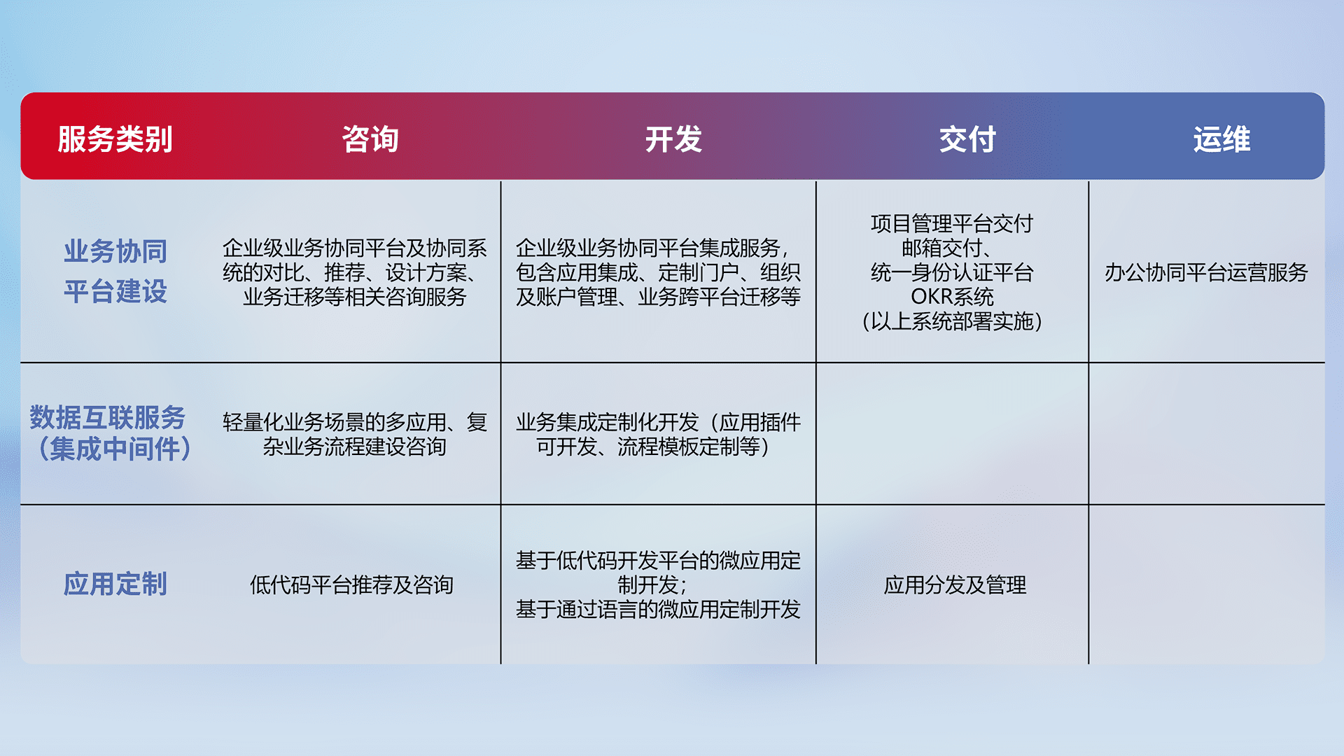 针对钉钉、、、企微、、、IDaas等平台级产品提供产品的规划、、、方案、、交付、、、定制化开发等服务,,,实现如统一协同办公、、、、智能客户服务、、混合会议管理、、智能数据查询、、、、等业务场景,,实现数字化转型。。