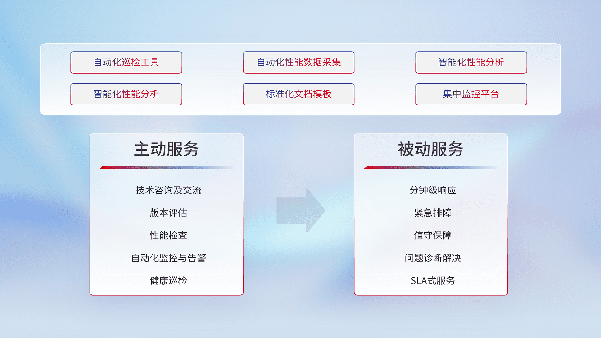 智能化工具和标准化文档,,保障服务质量,,,,提供主动服务(包含技术咨询、、、版本评估、、性能检查、、、自动化监控与告警、、健康巡检)和被动服务包含(分钟级响应、、紧急排障、、值守保障、、问题诊断解决、、SLA服务)。。。。